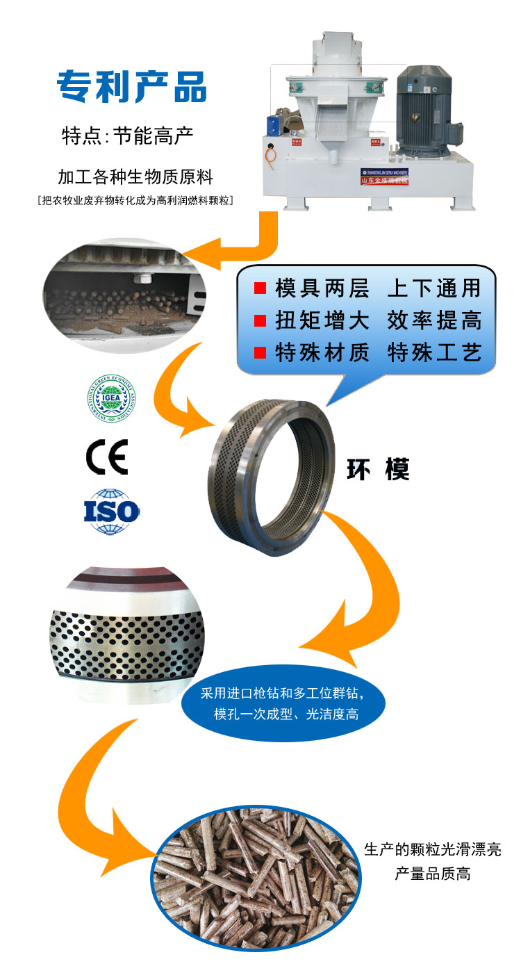 生物鍋爐蜜桃AV在线网址是采用電機直聯方式運轉,電動機通過齒式聯軸器與減速機軸聯接,經過90°變向,臥式電機傳動立式鑄件空心轉運主軸,主軸再帶動壓輥碾壓模具的內表麵完成壓製過程。工作時生物質木屑原料由進料口垂直落入,經過壓輪的旋轉使物料連續均布在模具內腔表麵(壓輥與模具的接觸立麵),在壓輥的碾壓下粉狀物料穿過模具的孔(均布在模具內表麵的孔)。此過程物料受到高壓、高溫的作用,產生物理變化或適當的化學變化(根據物料),促使粉狀物料形成不斷加長的圓柱狀實心體,再由斷刀切斷顆粒,從出料口排出,至此顆粒的壓製過程完成。